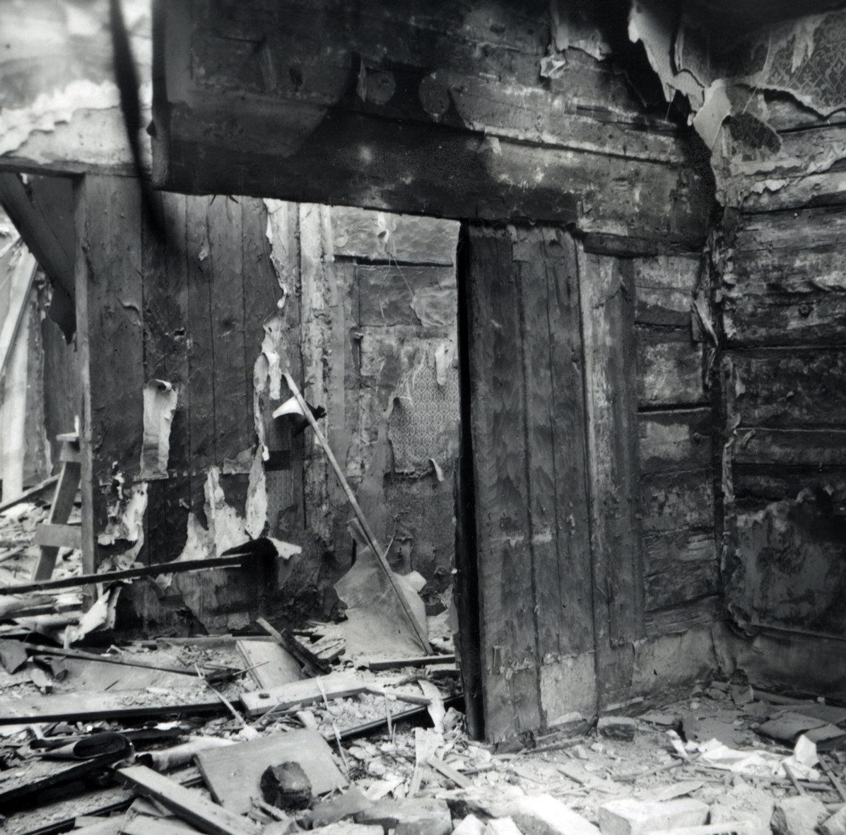 Rvning invändigt av väggar med liggande träpanel och takbjälkar i hus i kvarteret Krögaren på kvarnholmen