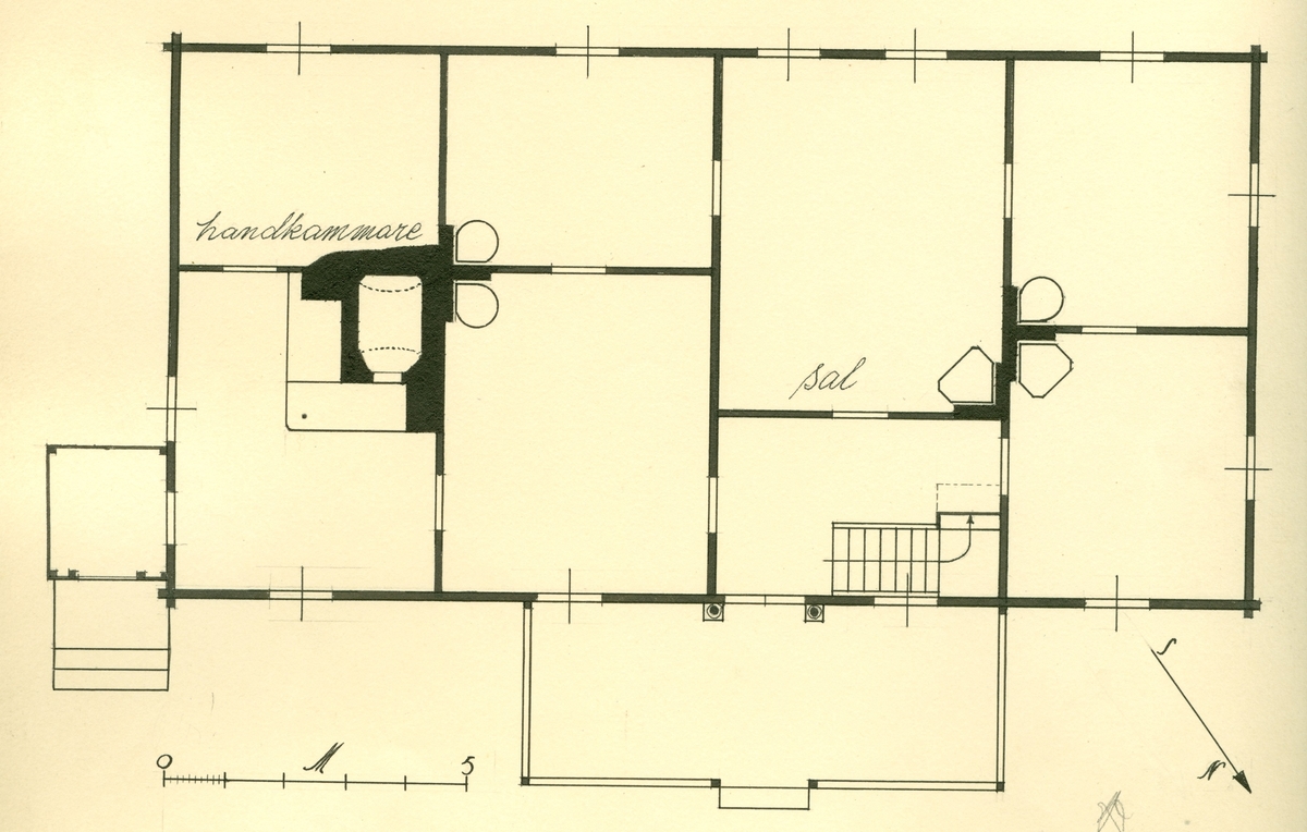 En planritning över manbyggnaden på Södra Saxnäs. Troligen uppmätt av Manne Hofrén.
