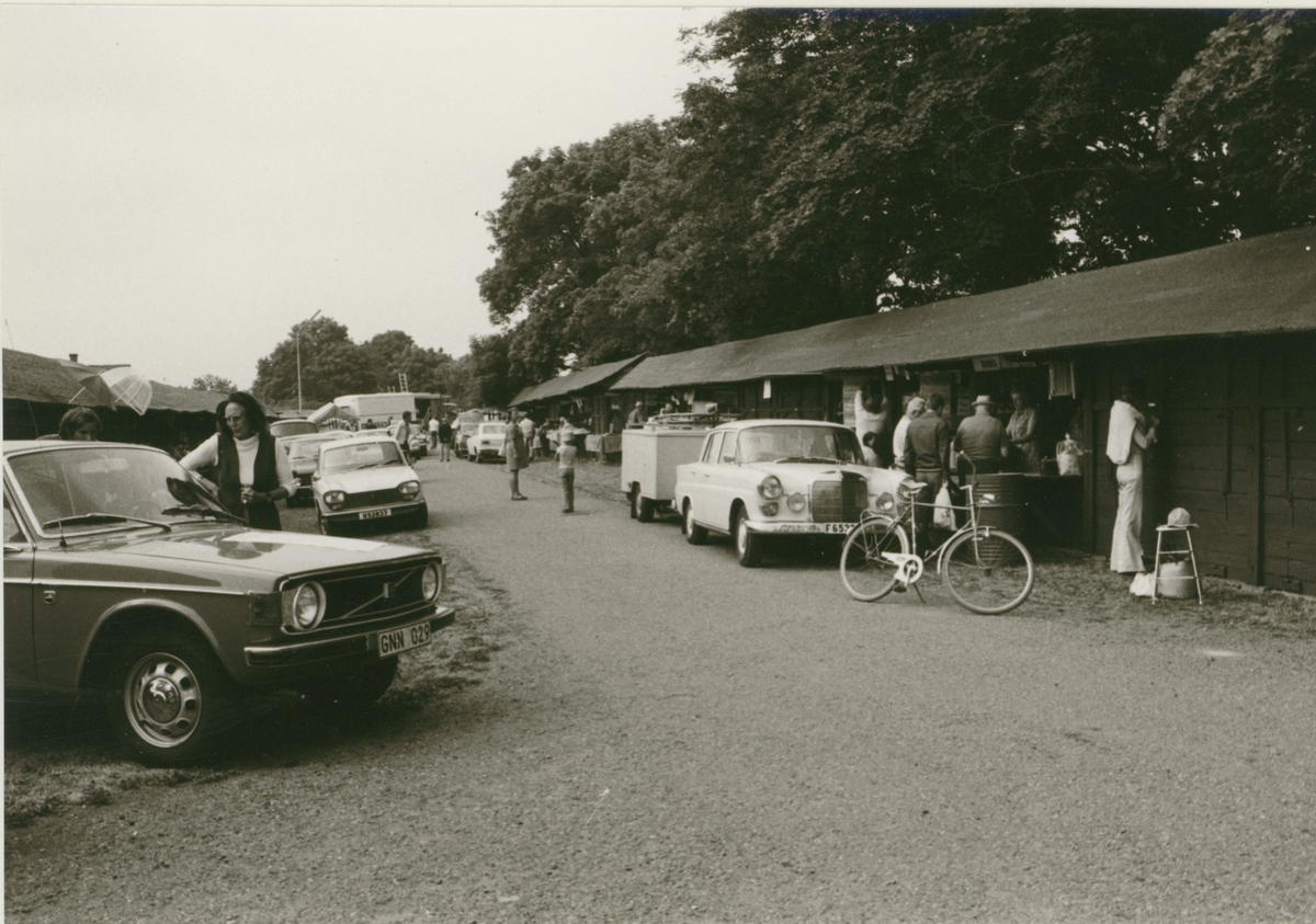 Algutsrums marknad. Från den gamla marknadsgatan. Marknadsbodar, folk och bilar.