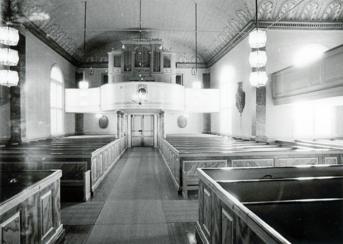 Interiör mot orgeln och orgelfasaden i Hälleberga kyrka innan branden 1976.