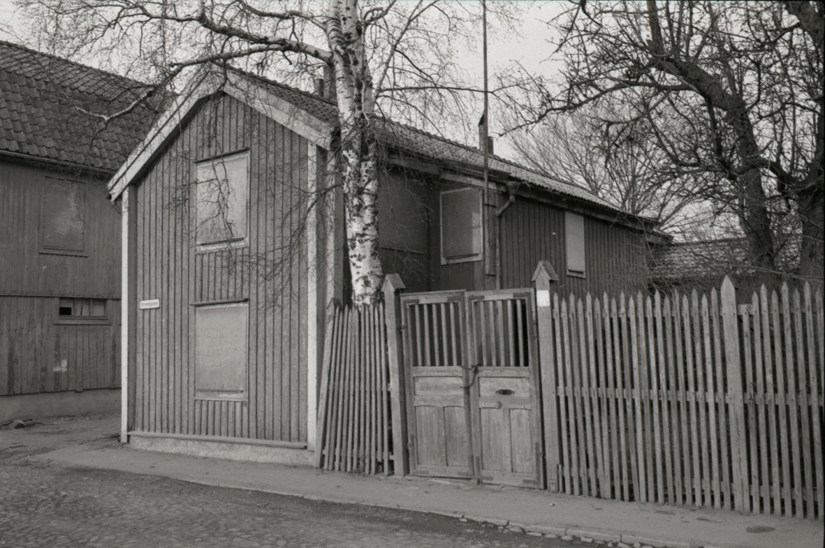 Ett bostadshus med lockläcktpanel och igenbommade fönster. Staket till höger bredvid huset på Strandgatan.