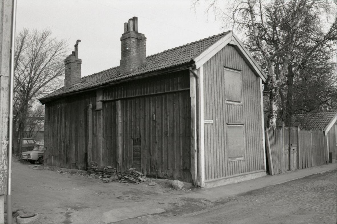 Ett bostadshus med lockläcktpanel och staket till höger på Strandgatan i Kalmar. Fönstren är igenbommade.