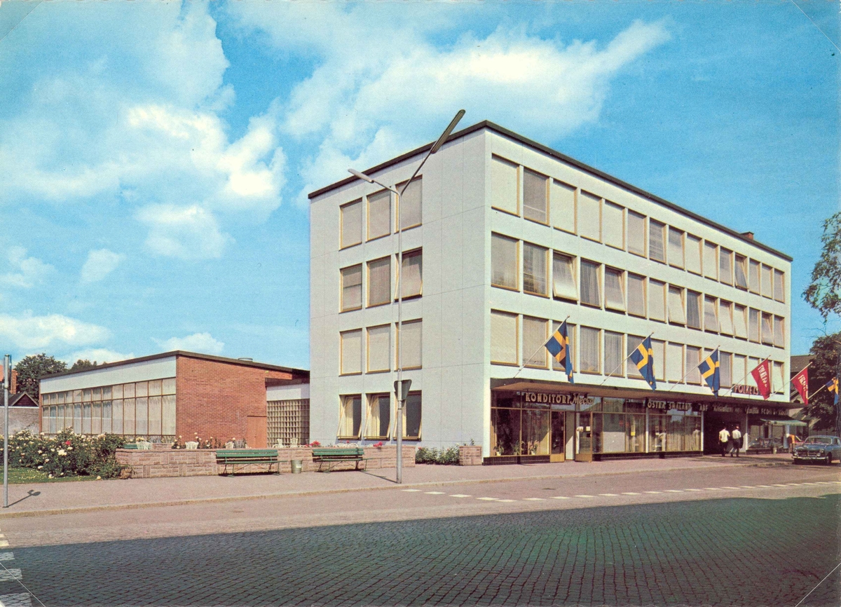 Folkets hus i Nybro. I byggnadens högra del låg vid tiden för fotot Konditori Mecka. Senare fanns en kinarestaurang här.