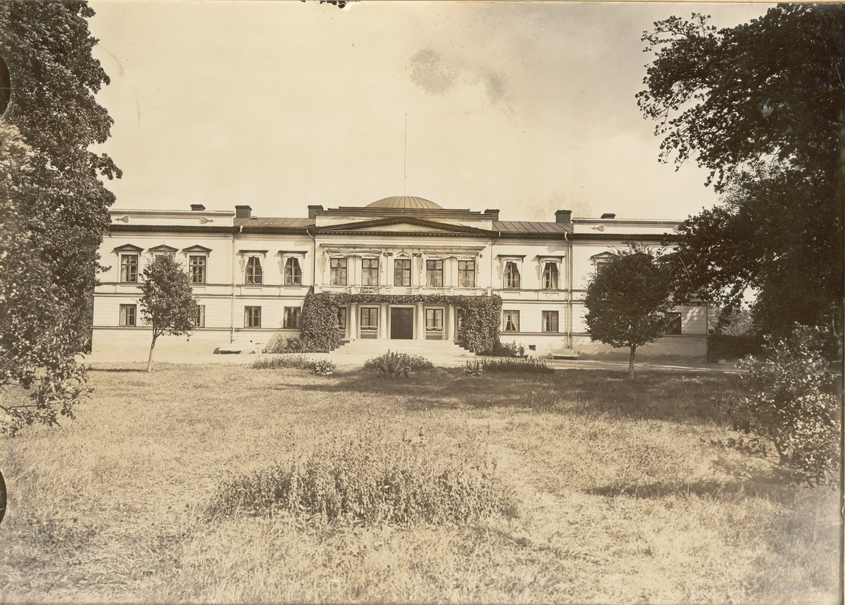 Titel: Gränsö slott, gårdsfasaden. Byggt av timmer och klätt med tjock puts. Byggt 1848 av byggmästare J. Jonsson, från Västervik Den äldre byggnad som fanns ingick i den nya. - Huset vitt, ornament grå.