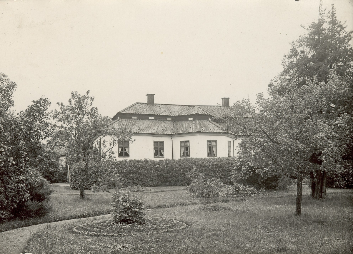Titel: Trädgården och huvudbyggnaden på Toverums säteri. Mellan huset och den klippta häcken rinner en bäck.