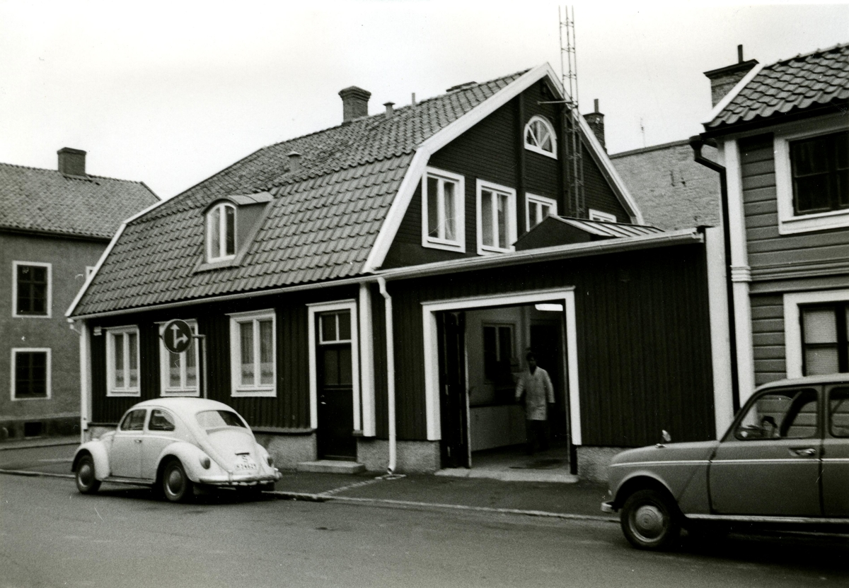 Bostadshus med mansardtak och port. Bilar på Storgatan.