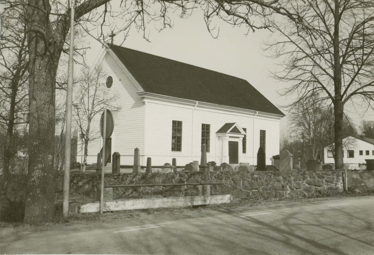 Karlslunda kyrka, i Påryd. Kyrkan är i nyklassicistisk stil med träfasad och spåntak. Mur till kyrkogård och gravstenar i förgrunden.