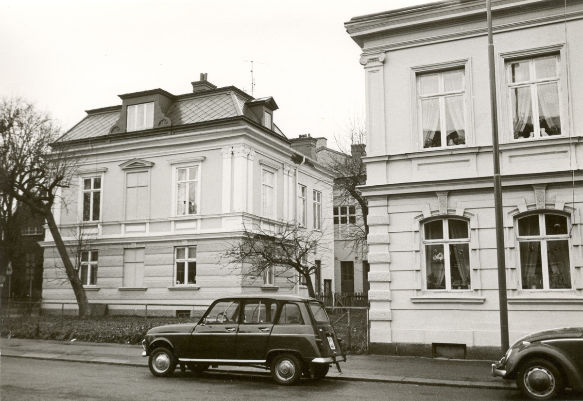 Fasad mot Postgatan tre. Bostadshus med putsrustik och gesims.