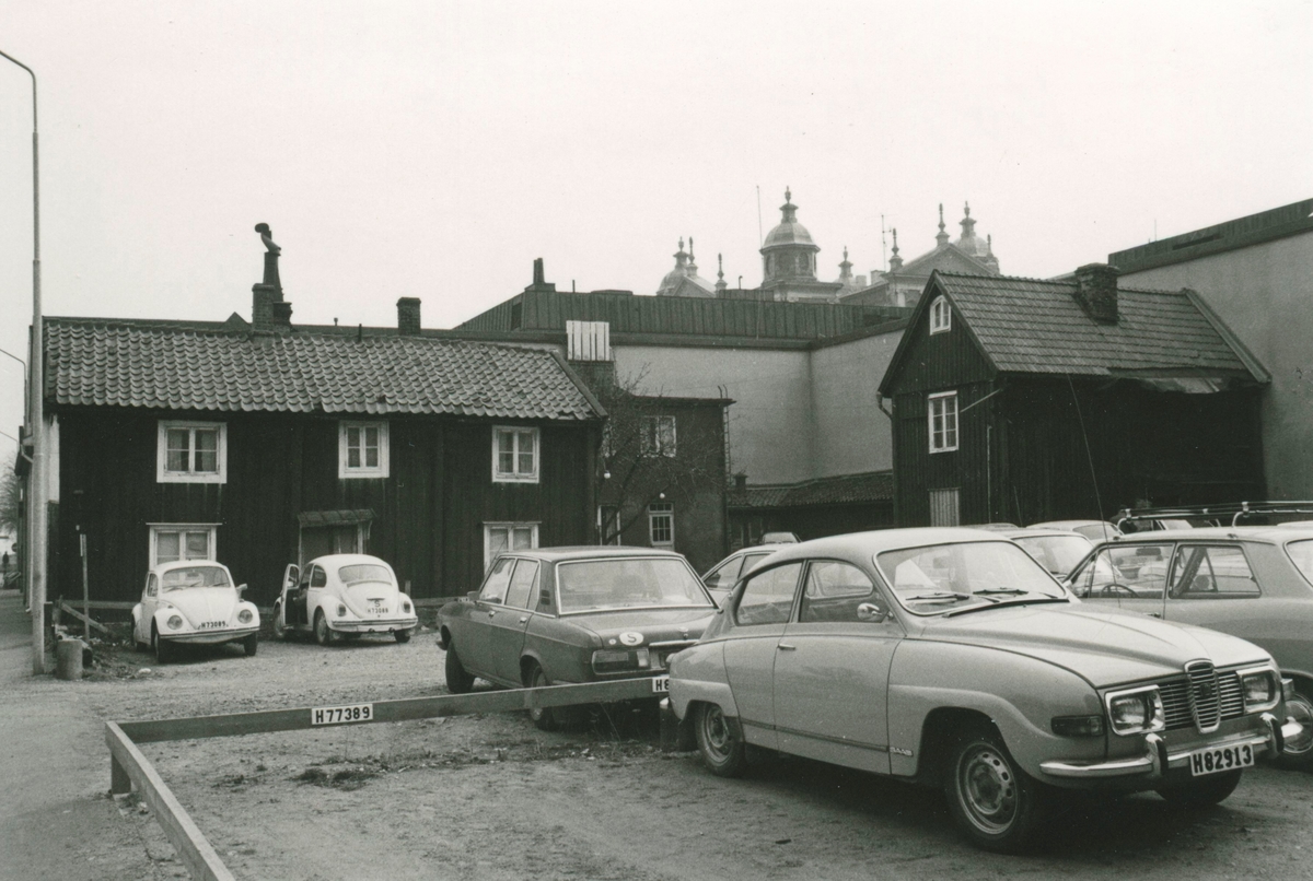 Gårdsinteriör med gårdshus, bilar och parkeringsplatser.