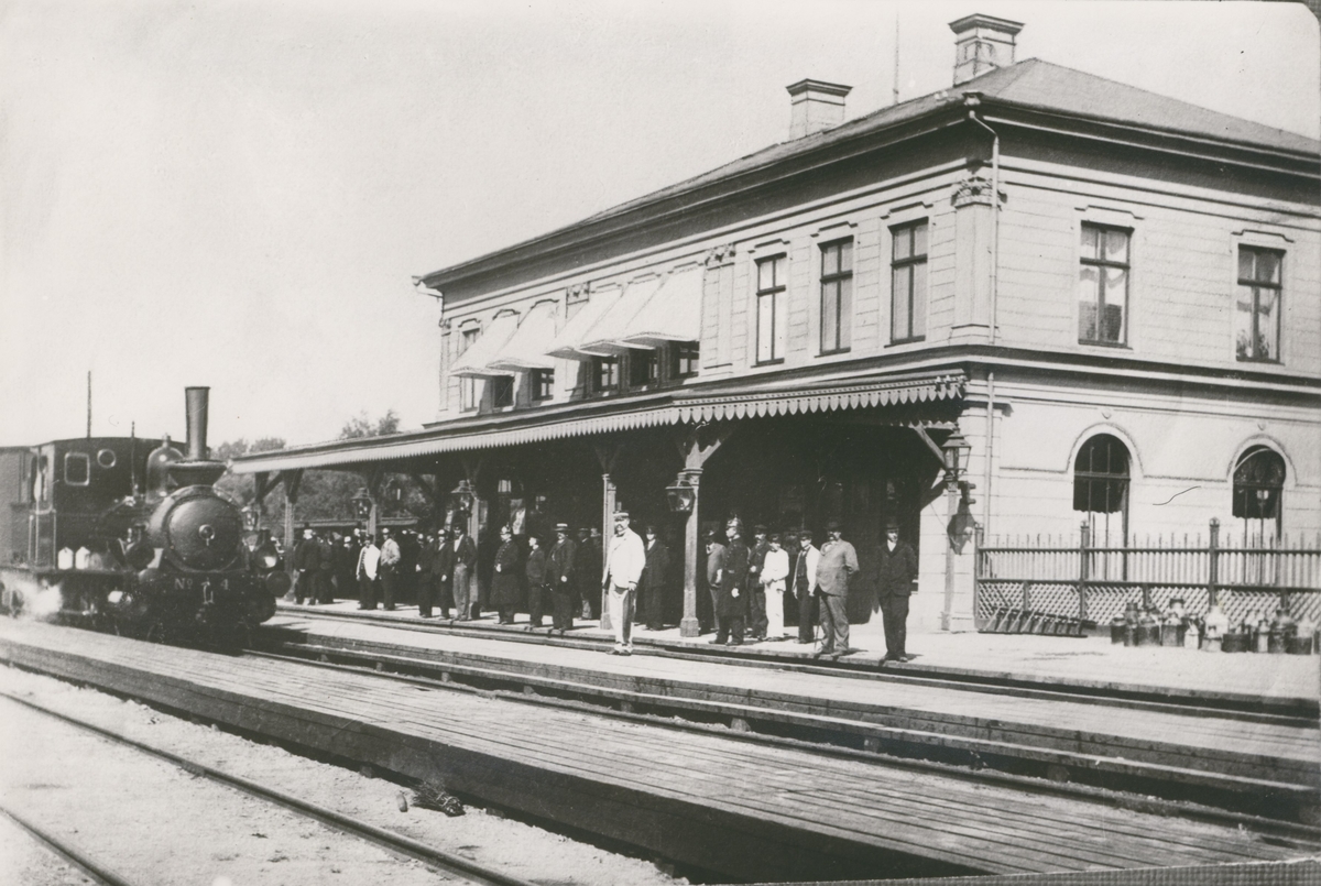 Fotot är taget före stationshusets ombyggnad, färdig 1911. Loket är "Gustaf Wasa" (Kalmar järnväg, lok nummer 5), byggt av Nydqvist & Holm i Trollhättan 1875. Det togs ur trafik 1915. Tenderlok med två kopplade axlar och en löpaxel framtill.