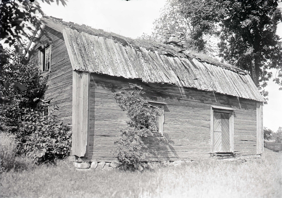 Äldre timrat bostadshus med förfallet torvtak i Högsby.