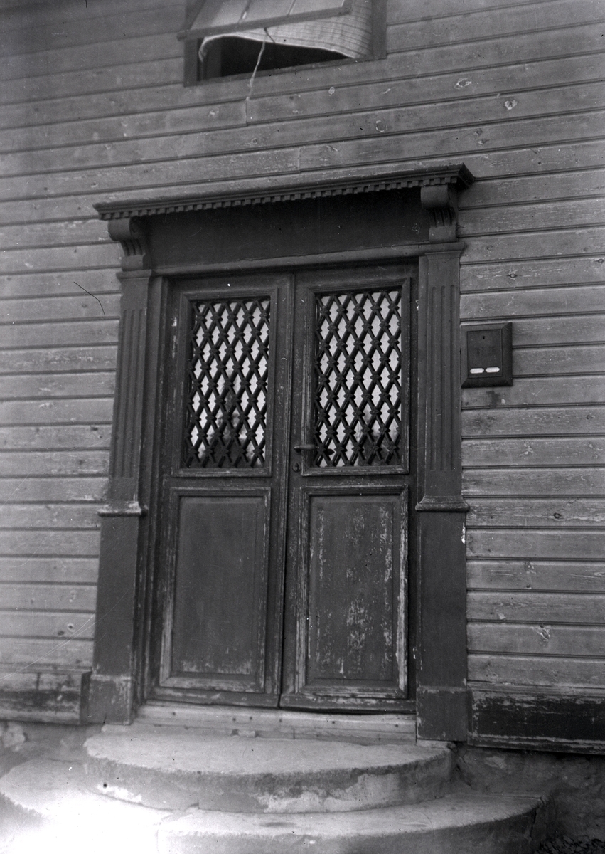 Port med omgivande pilastrar på ett bostadshus.