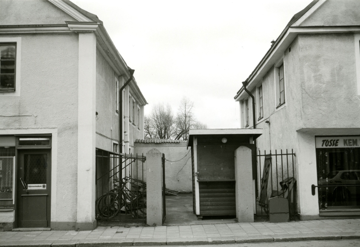 Port med järngrind, till innergård på Kaggensgatan i Kalmar, mellan en uraffär och Tusses kemtvätt. Till höger om porten står en stängd lottkiosk.
