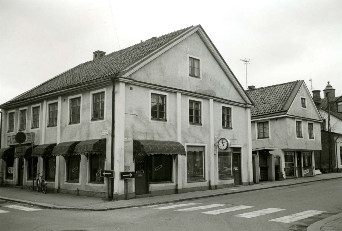 Hörnet Fiskaregatan-Kaggensgatan, kvarteret Tenngjutaren, i Kalmar. närmast i bild syns en uraffär på Kaggensgatan och i nästa hus, till höger, Tusses kemtvätt.