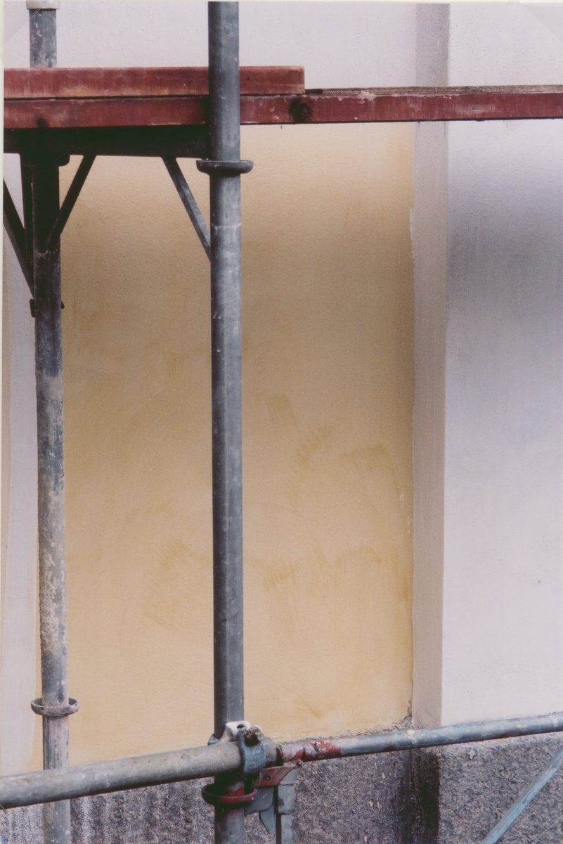 Färgprov på fasaden inför ommålning av Virserum kyrka.