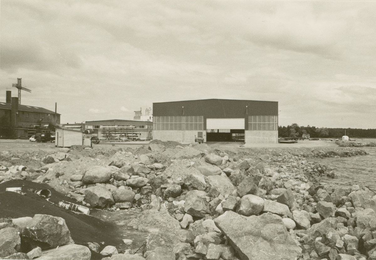 Brännarhallen var precis invigd då fotot togs. Där bereddes bordläggningsplåtar till nybyggen, med hjälp av stora, självgående skärbrännare.