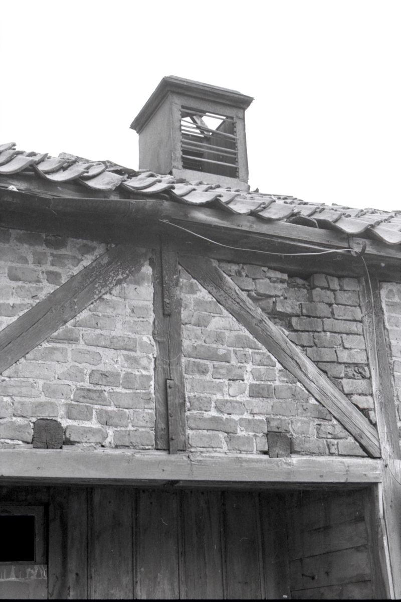 Uthus i korsvirke i kvarteret Domherren 12. Väggdetalj, takfot, lufttrumma på tak.
