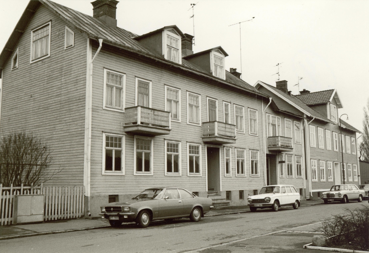 Radstående tvåvånings flerfamiljshus med träfasad, Heijocksgatan i Kalmar.