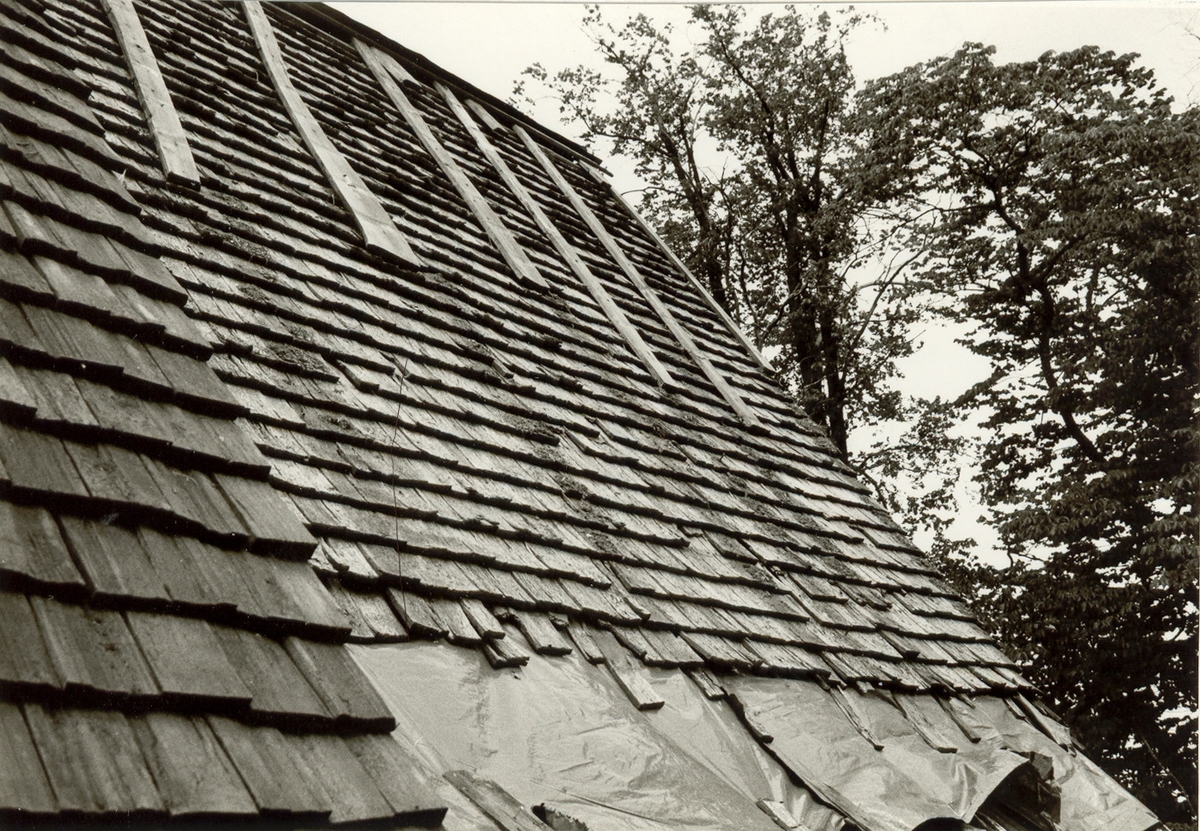 Detalj av äldre spåntak på södra sidan av korets tak.
