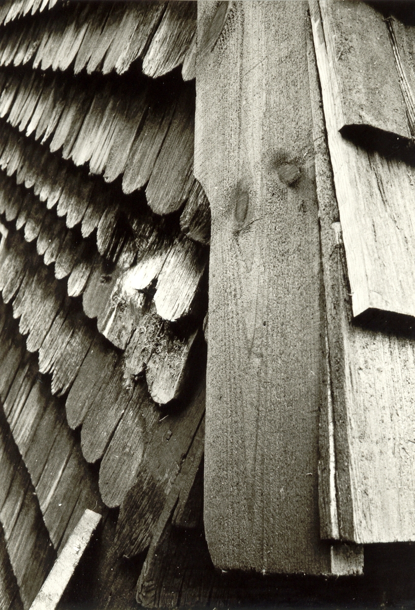 Efter restaurering. Detalj av nylagt spåntak och vindskivor.