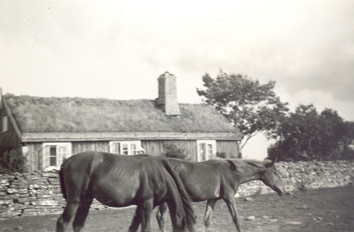 Betande hästar vid ryggåsstuga i Lunda, Kastlösa.