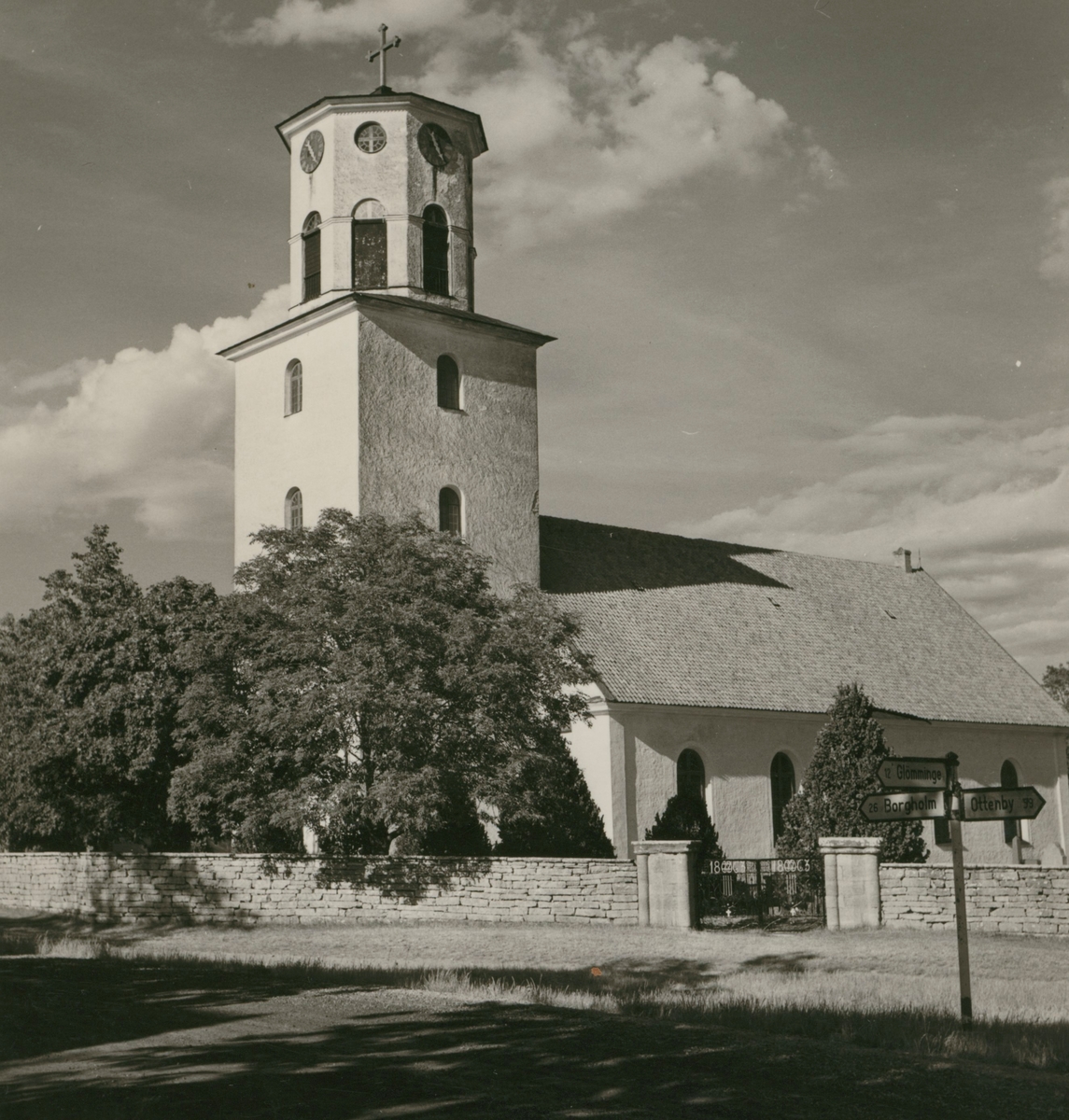 Titel: Runstens kyrka, Öland. Kyrkan har ett rektangulärt långhus. Koret med utbyggd sakristia ligger i öster. Runstens kyrka är uppförd i nyklassicistisk stil. Kyrkans yttre har inte ändrats sedan den uppfördes åren 1835-36 och invigdes 1841. Tidigare fanns på platsen en klövsadelskyrka. Av denna återstår endast grundmurarna som befinner sig under den nya kyrkans gräsmatta, strax söder om nuvarande kyrka. Taktäckningen på långhuset är taktegel, tornet är beklätt med kopparplåt. Kyrkan har sadeltak, vilket är valmat över sakristian. Tornet pryds av en åttakantig lanternin. Fönsterbågarna är stora och rundbågade och bryter igenom de vitputsade murarna. Ingångar finns genom tornportal och mittportal på sydsidan. 1962 togs en portal upp vid sakristian. (wikipedia)