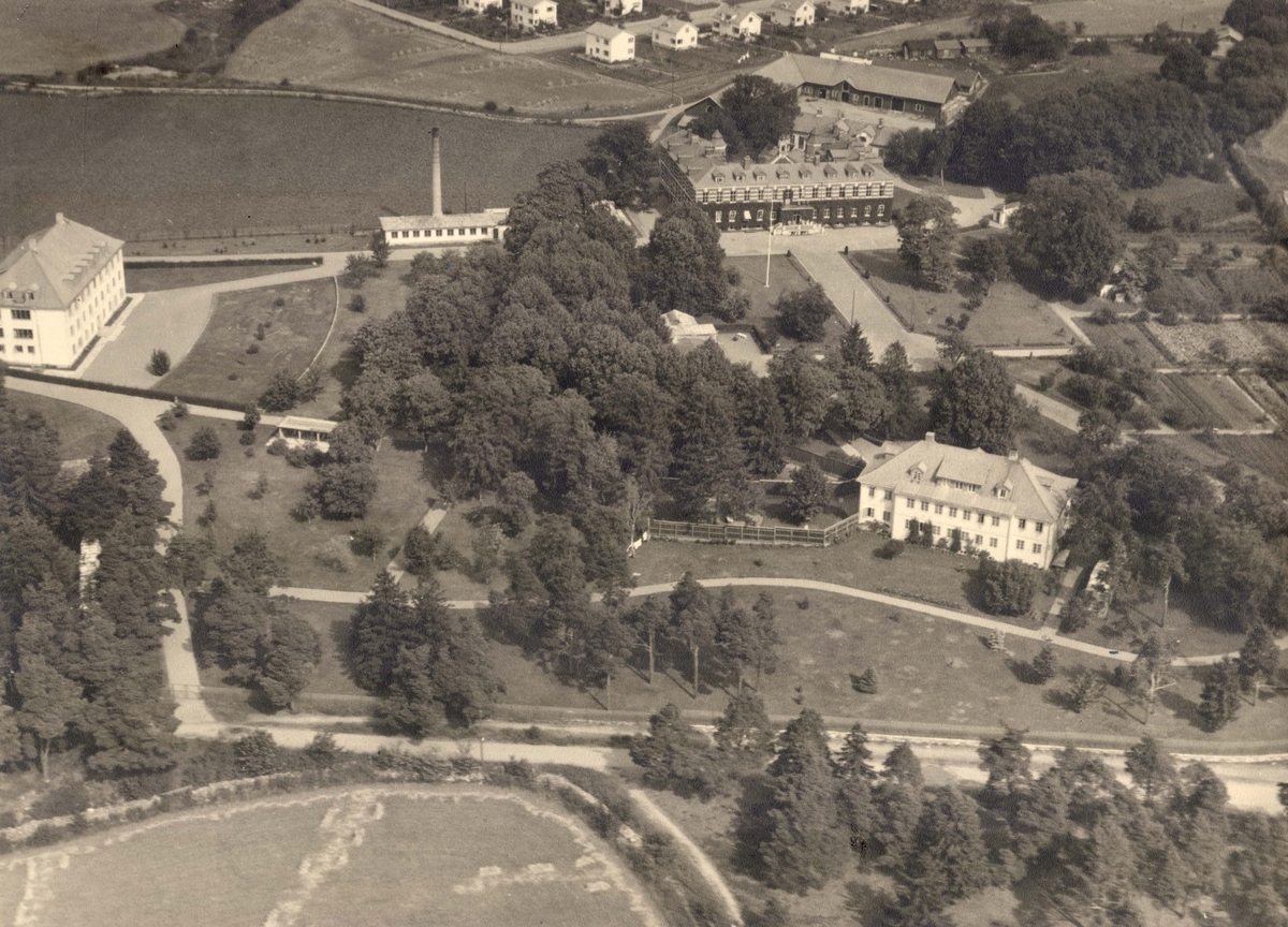 Flygfoto över Kalmar ålderdomshem med tillhörande två sjukhus.