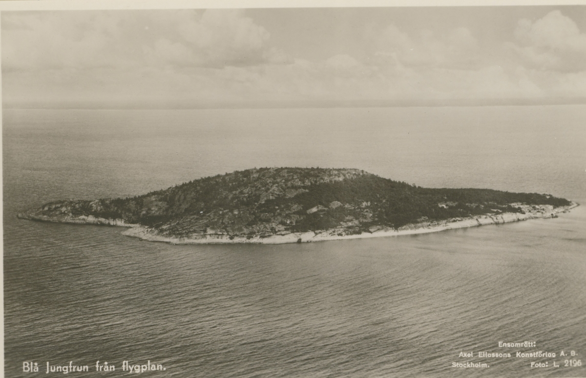 Vykort med motiv från Blå Jungfrun. Blå Jungfrun från flygplan.