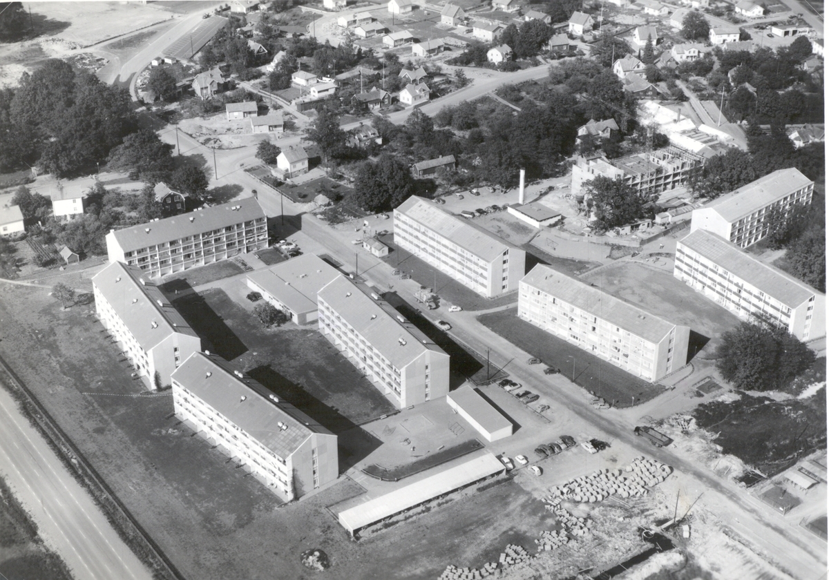 Flygfoto över Mönsterås. Flerfamiljshus under byggnad.