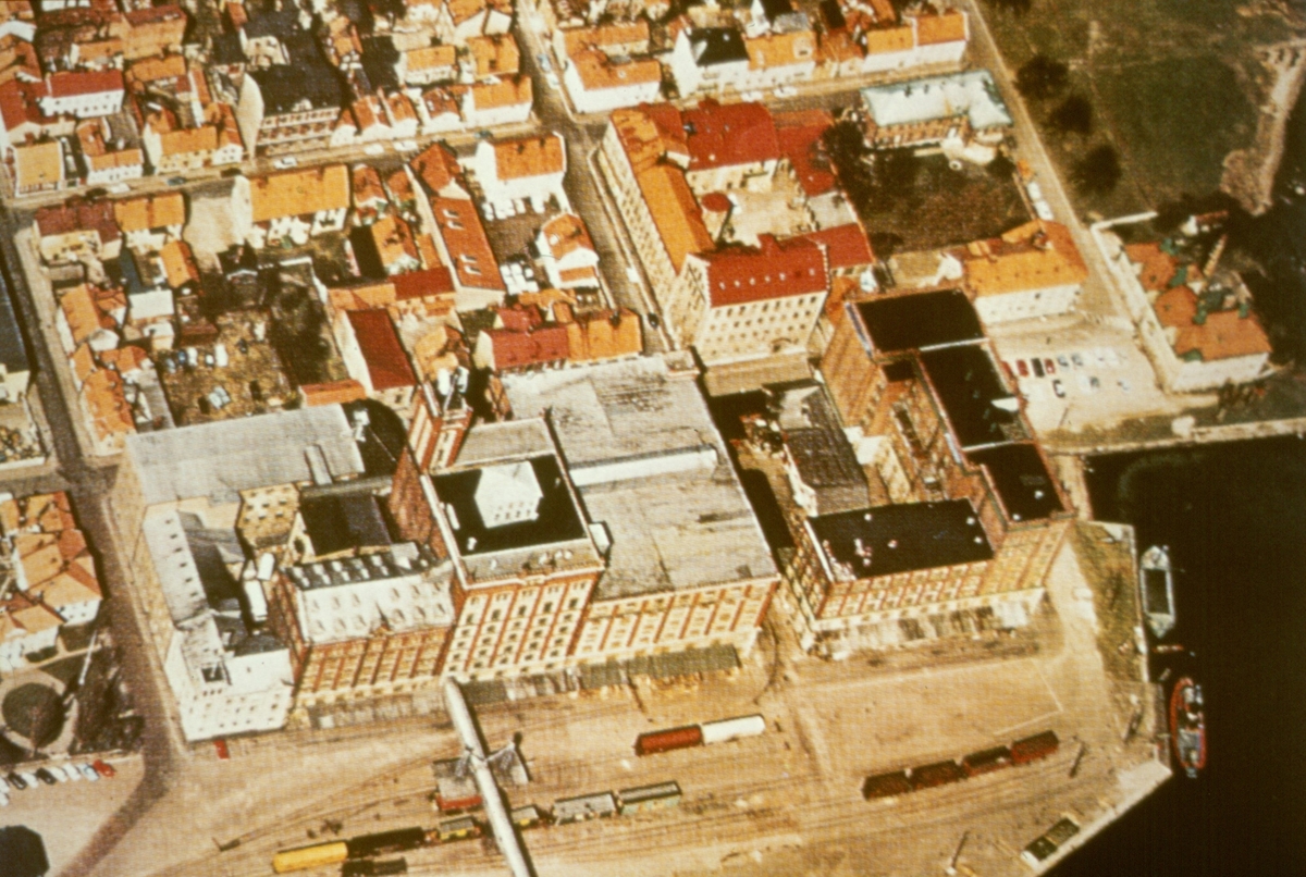 Flygfoto över östra kvarnholmen. Observera att ångkvarnens elevator finns kvar och att det fortfarande går tåg ut på elevatorkajen.