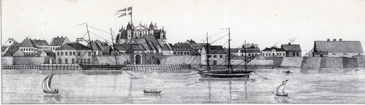 Teckning av 1700-talets Kvarnholmen från hamnen.