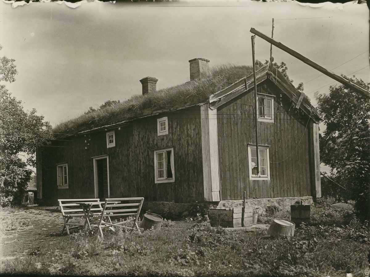 Stuga med torvtak och flis i takfoten.