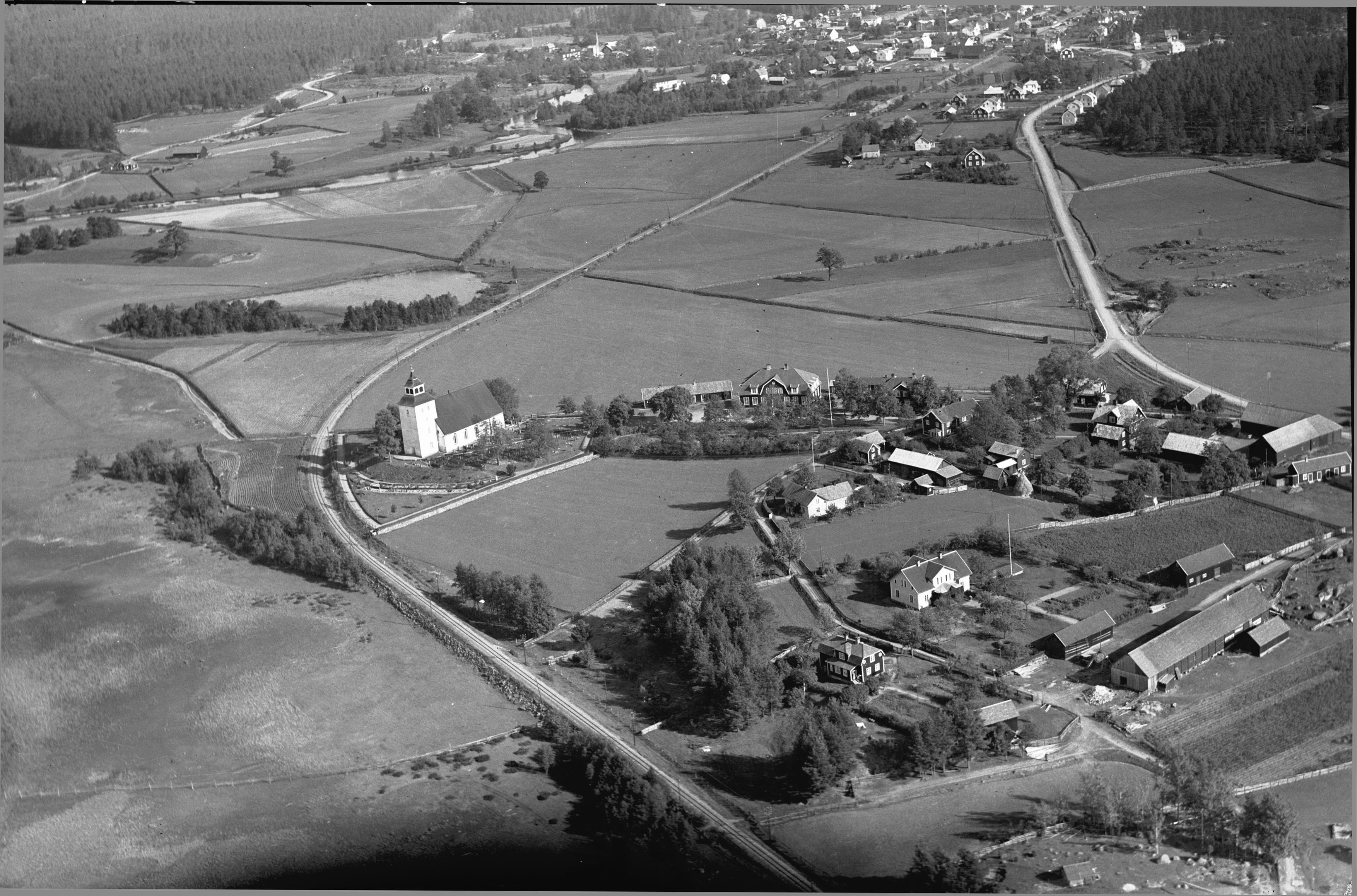 Kyrkan från sydväst, flygbild. Järnforssen i bakgrunden.