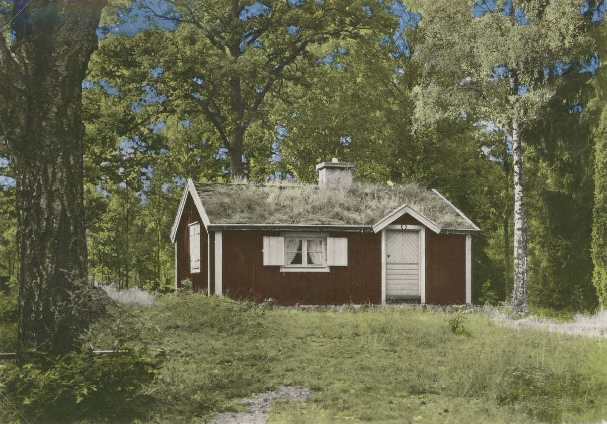 Ryggåsstugan i Emmabodas hembygdspark. Kolorerat vykort.