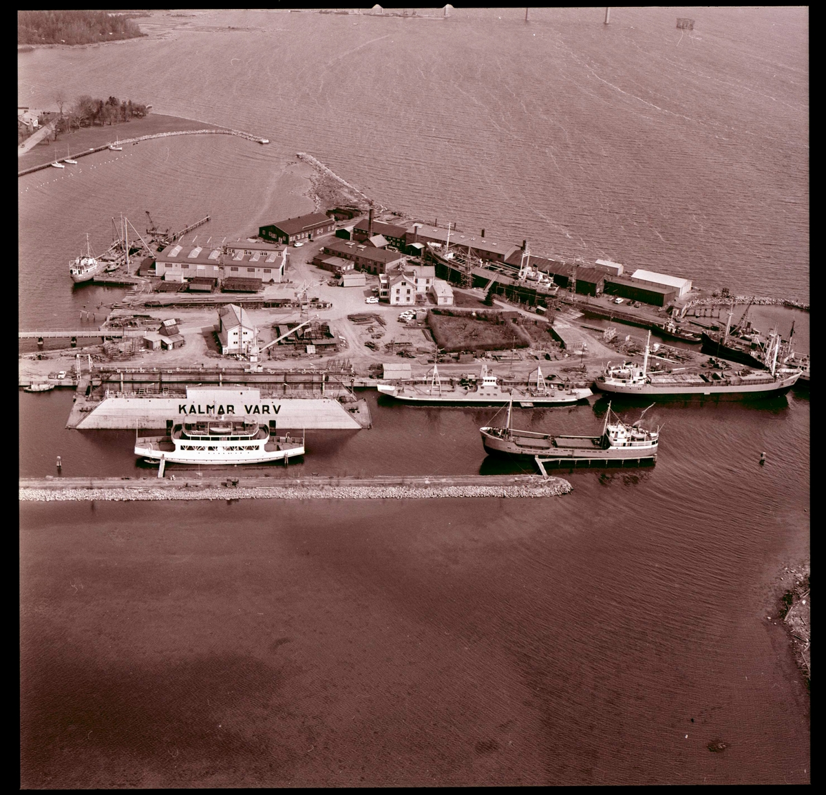 Kalmar varv. Varvsholmen från luften. I bildens mitt syns torrdockan med texten Kalmar varv.