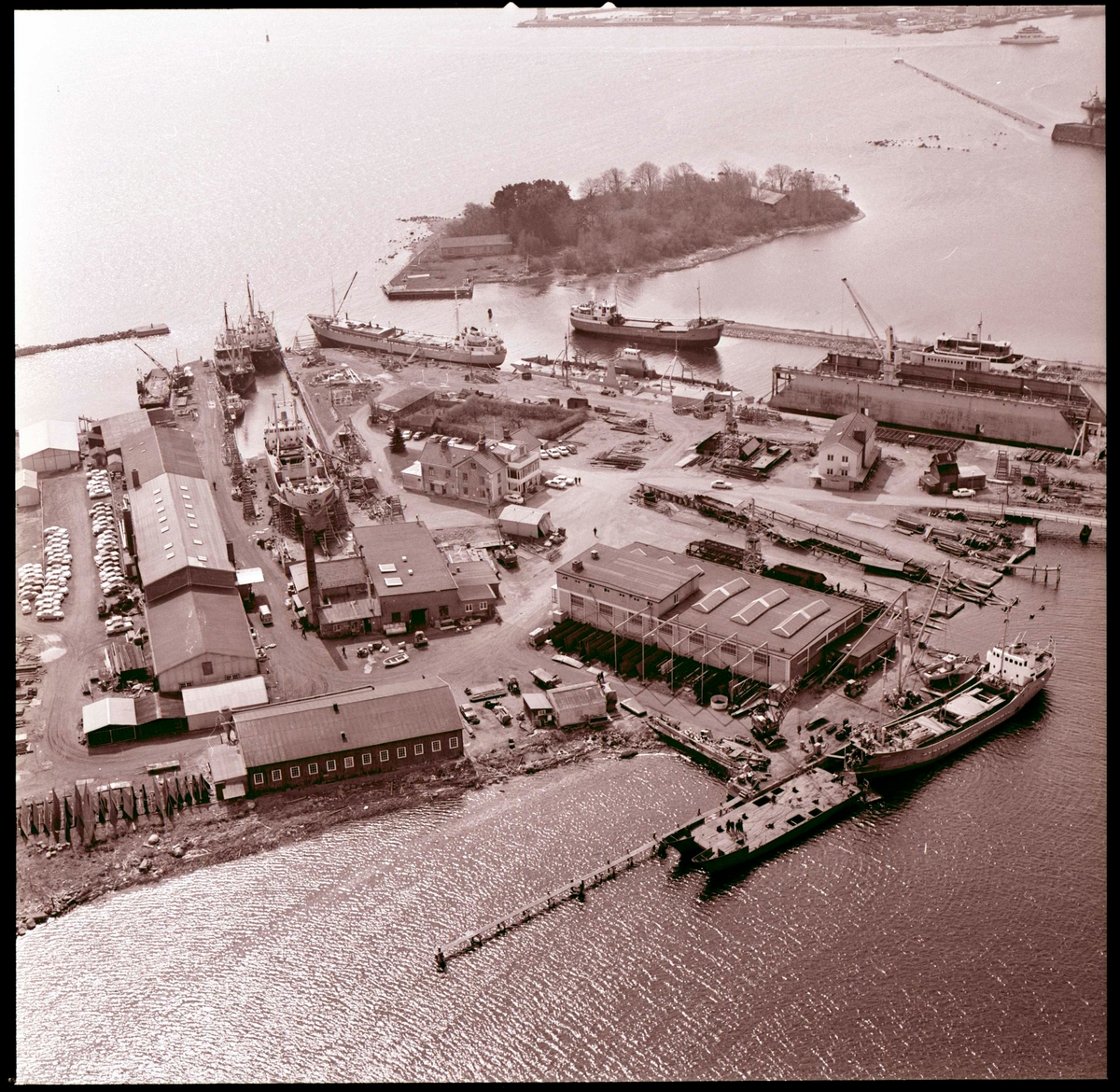 Varvsholmen från luften. Kvarnholmen till höger utanför bild. Den mindre ön är Laboratorieholmen.