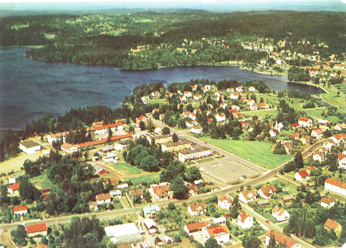 Flygfoto över Virserum, bland annat kyrkan, Virserumssjön och Dackemonumentet.