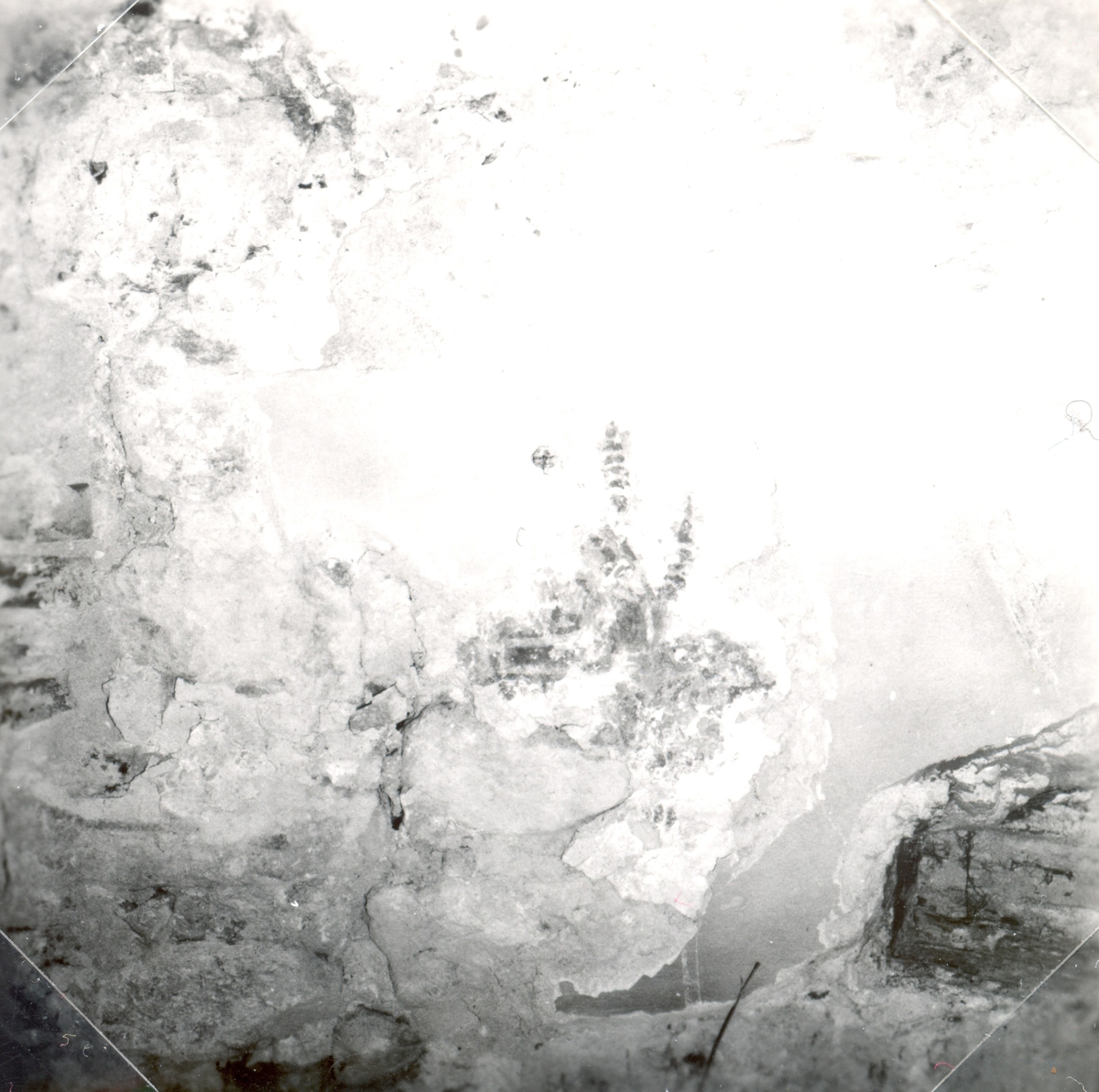 Voxtorps kyrka. Utgrävning av den medeltida kyrkan. Kalkmålning på vägg.