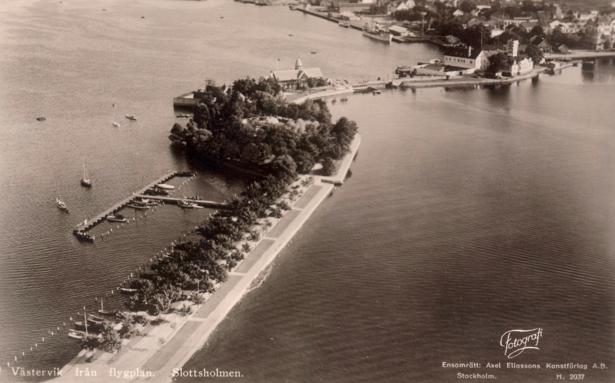 Vy från Slottsholmen i Västervik. På bilden syns kallbadhuset som förstördes i en eldsvåda 1950.