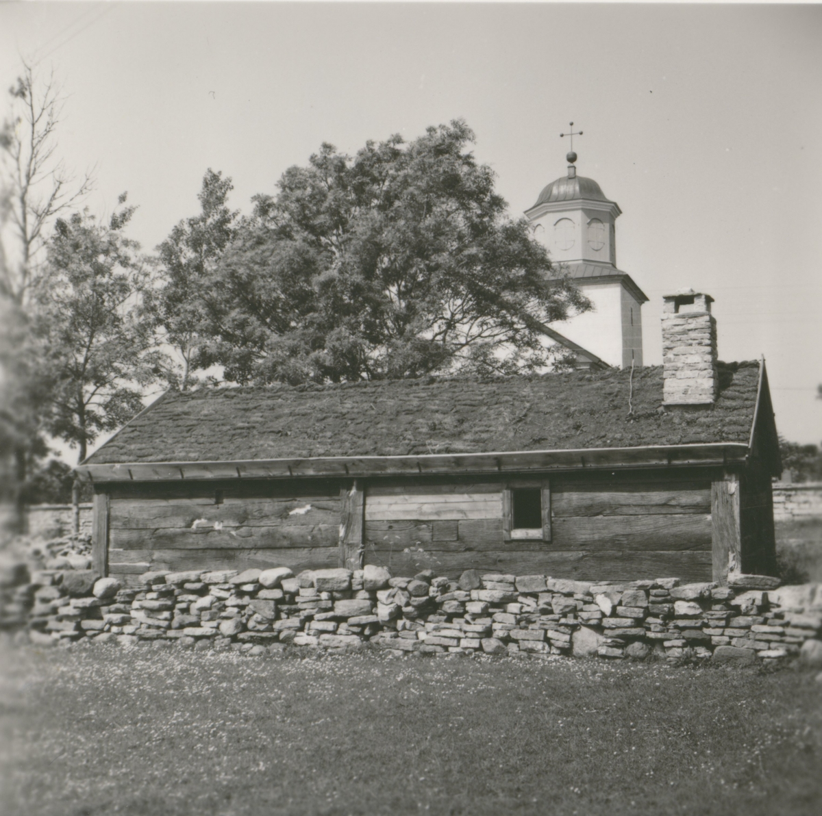 Ryggåsstuga i Stenåsa. Kyrkan syns i bakgrunden.