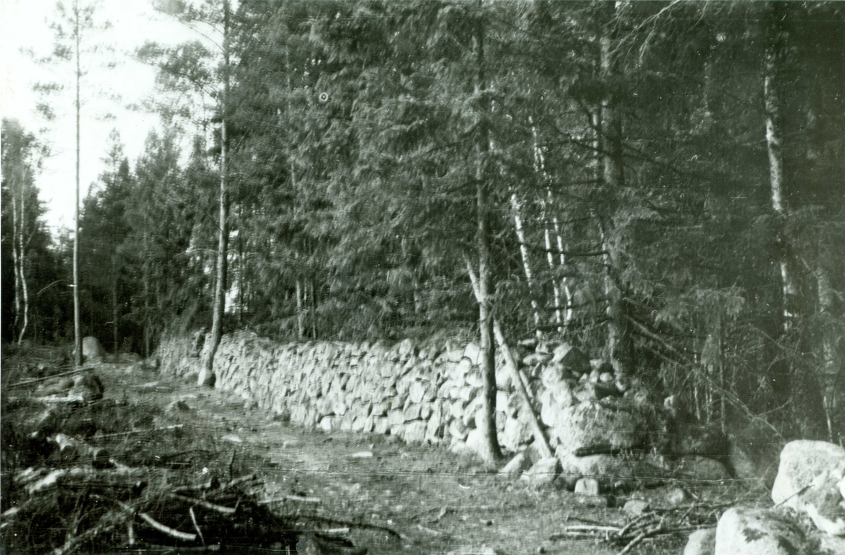 Befästningsanläggning i skogen i Starbäck. Ett stycke av västra omfattningsmuren.