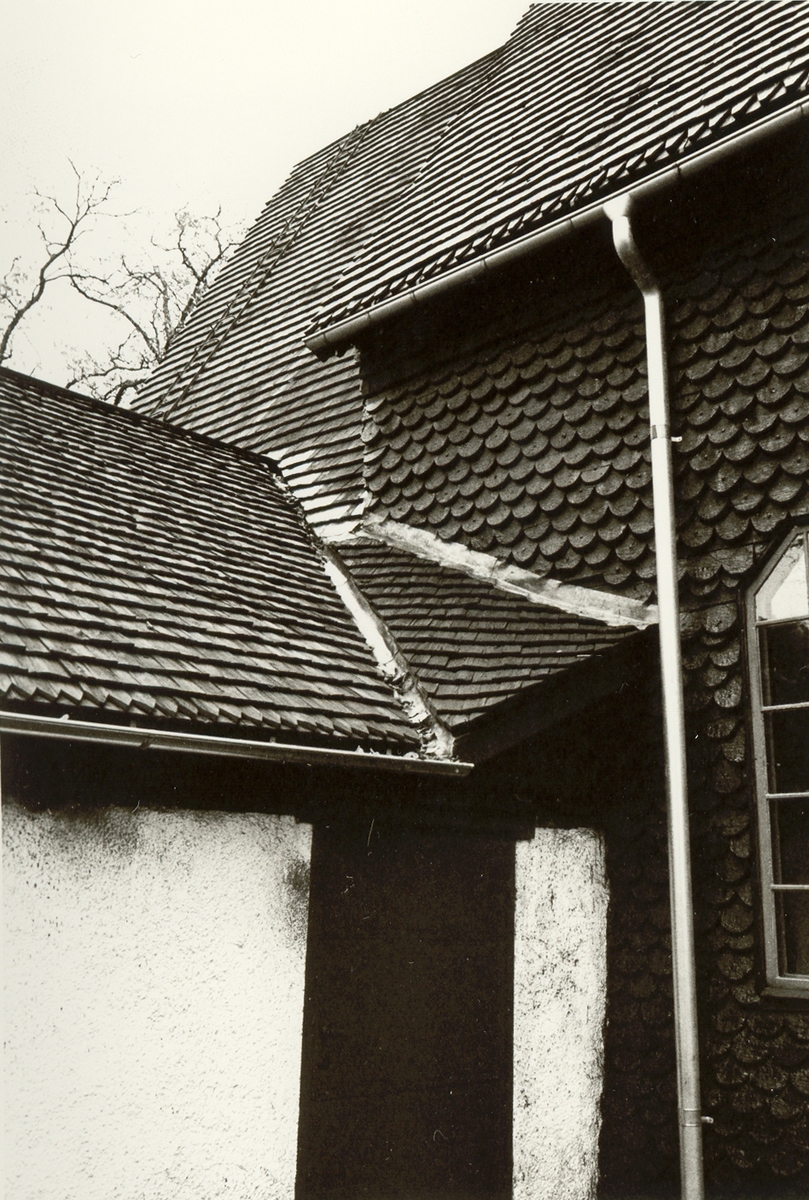 Pelarne kyrka efter restaurering. Plåtränna och plåtavtäckning mellan sakristia och långhus.