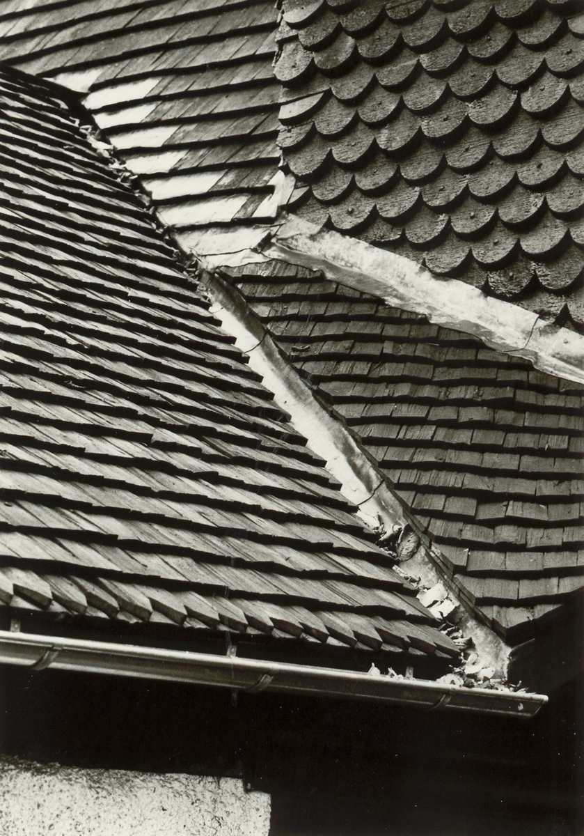 Pelarne kyrka efter restaurering. Plåtränna och plåtavtäckning mellan sakristia och långhus.