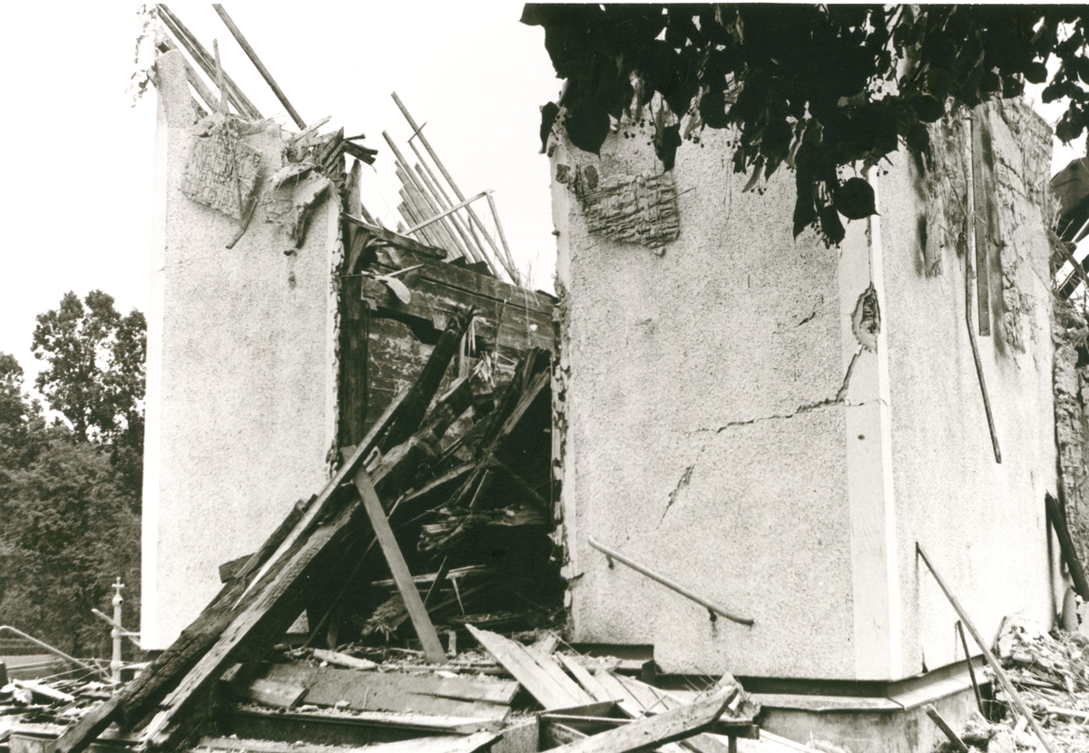 Hälleberga kyrka: Kyrkan brann ner 1976-10-18. Branden orsakades av ett elfel.