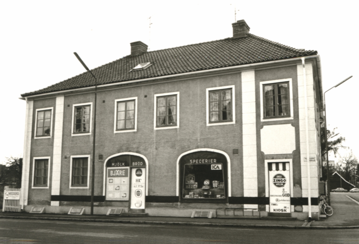 Ett flerbostadshus med en livsmedelsbutik i entréplanet.