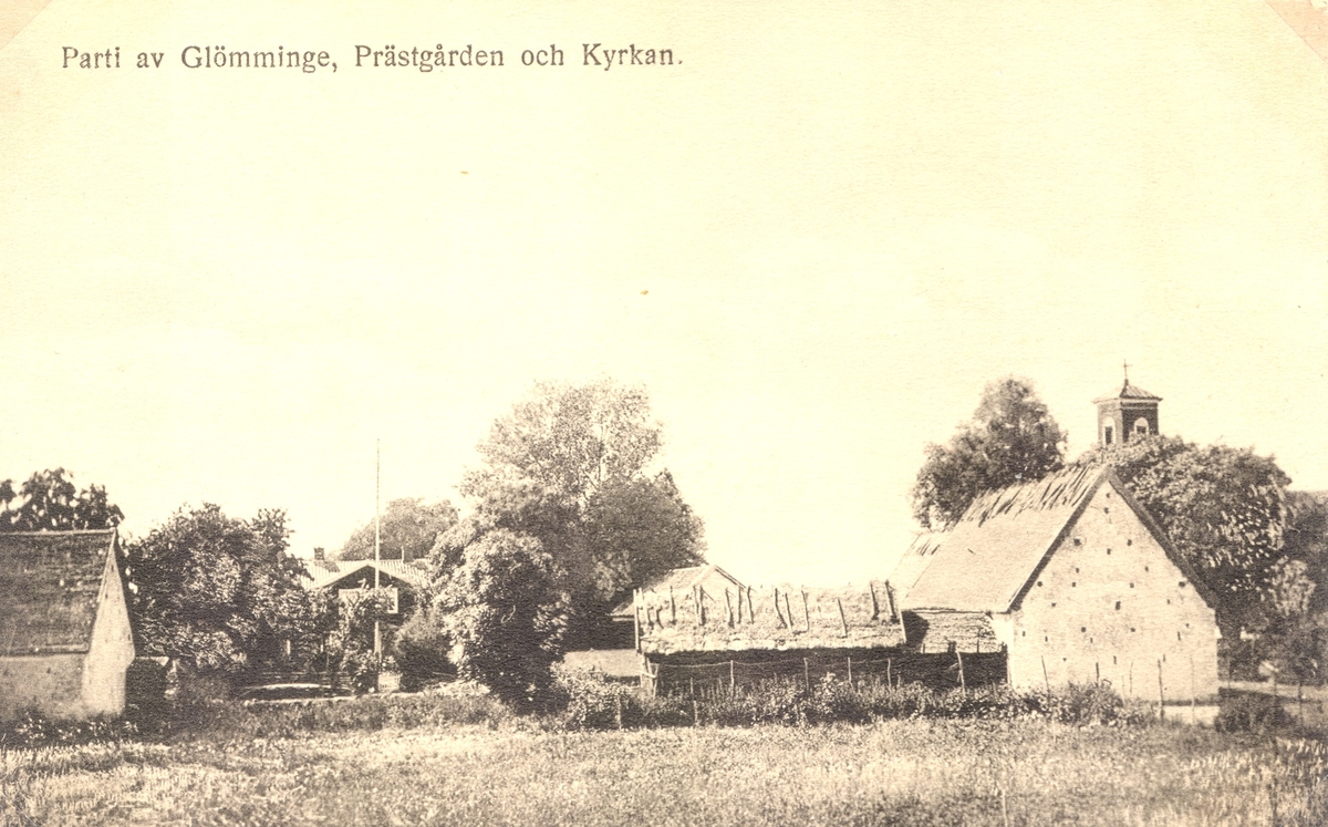 Vykort med motiv av Glömminge prästgård. Kyrkans torn skymtar till höger i bakgrunden.