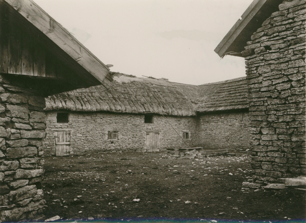 Ladugård med stenfasad och stråtak i Berga på Öland.