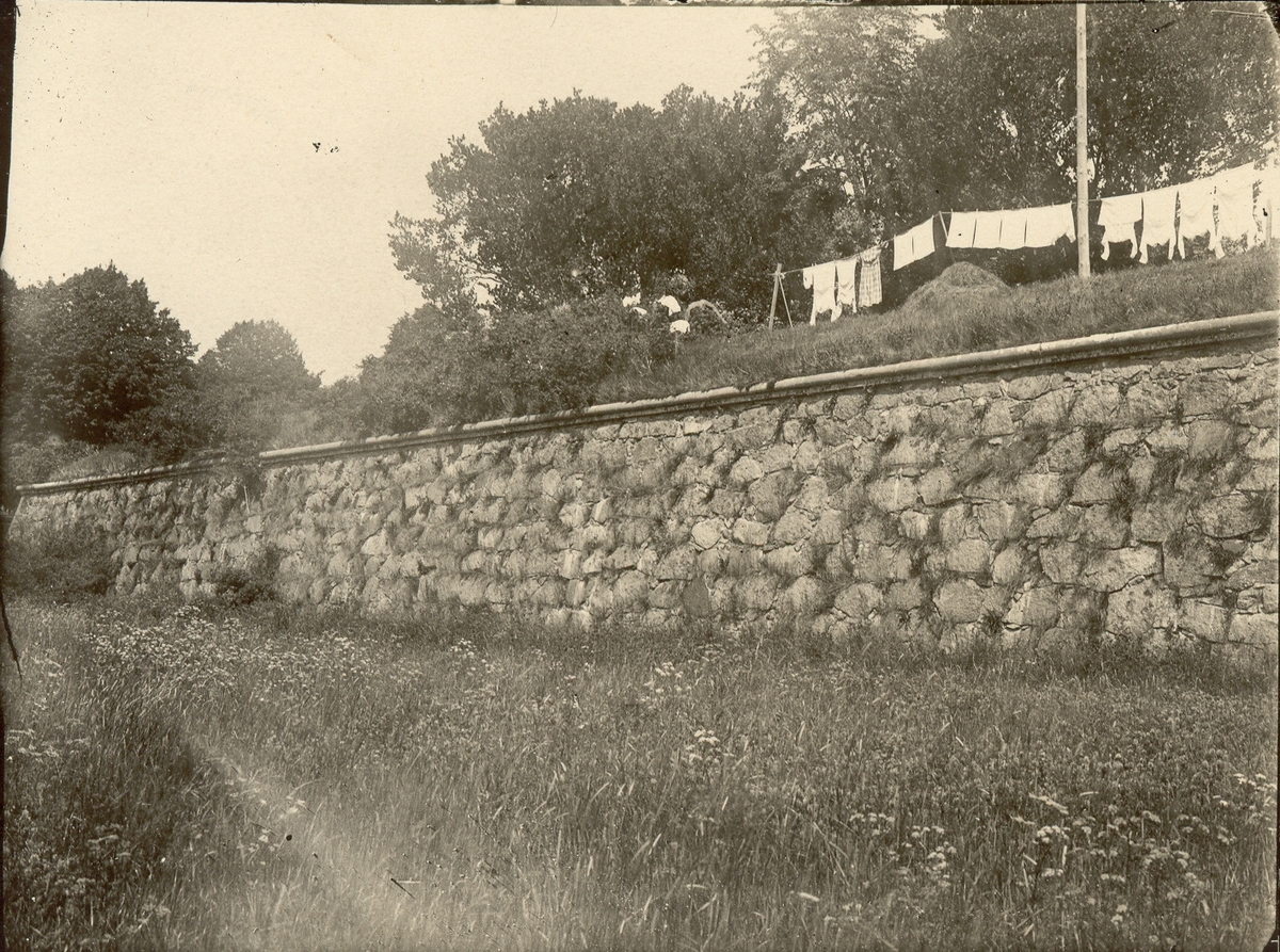 Titel: Torrgraven på Kalmar slott. Kastellansfrun har tvätt på tork.