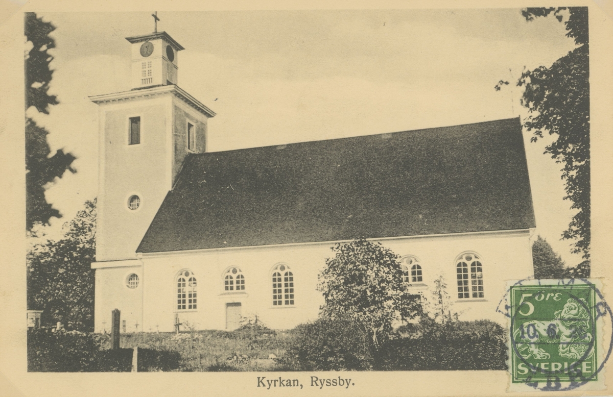 Vykort med motiv av Ryssby kyrka.
