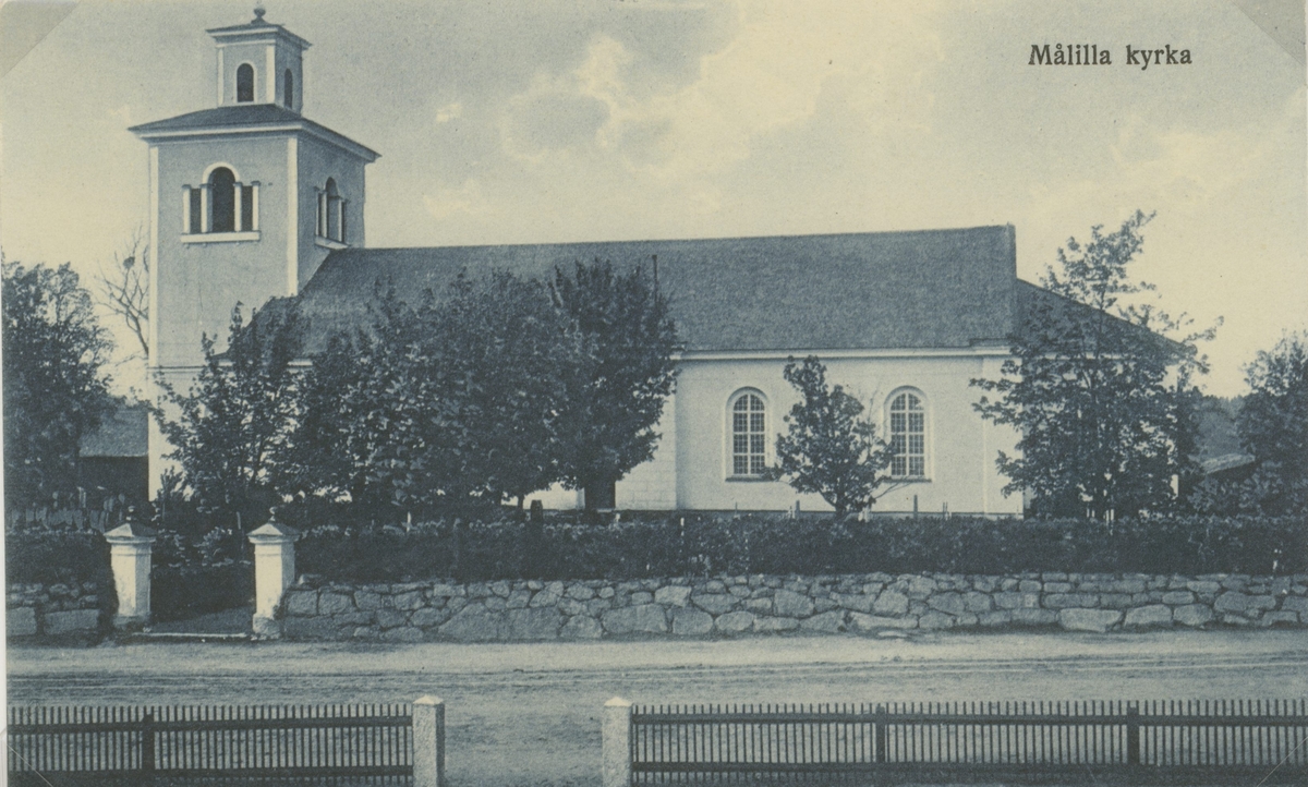 Vykort över Målilla kyrka som byggdes i nyklassicistisk stil mellan 1820-1822.